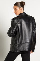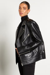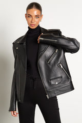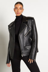 This traditional box-cut leather biker jacket comes with statement shoulders for added edge. Made from the softest leather, this jacket features traditional biker styling and hard-wear, including adjustable zipper fastened cuffs.