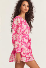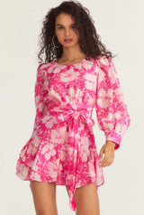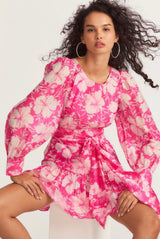 Get gussied up in the Teyana Dress. This swishy party dress is both classic and playful with a circle neck surrounded by decorative buttons at the shoulders, shirred blouson sleeves and buttoned cuffs. Below a shirred high waist seam, the skirt flares to a shirred flounce with layered hem at bottom. Functional buttons line the center back.
