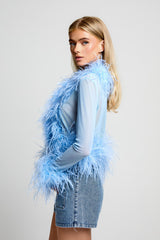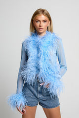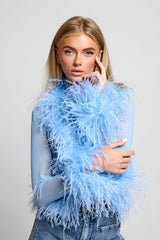 The Ambra Feather Top is a striking statement piece featuring delicate feather detailing around the front, cuffs, and back, creating a textured and elegant look. Designed as a one-size garment, it offers a versatile fit that combines both elegance and comfort. The stretchy fabric ensures ease of movement and a flattering silhouette, while hook and eye fastenings at the front provide secure closure without compromising the top’s sleek design.