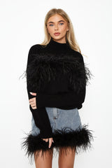 Elevate your everyday basics, denim offset with a fluttery feather trim.