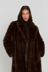 The Jackie Premium Faux Fur Coat offers a luxurious long silhouette in rich brown, highlighted by an elegant collar detail for timeless sophistication and warmth.